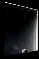 Een ei voor het raam met reflectie in de smerige ruit. dit beeld roept veel vragen op; wat doet dat ei daar en waar is dit? Het licht komt door een spleet naar binnen, verder is het donker en zwart.