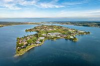 Luchtfoto van het grootste eiland in het Bodenmeer - het eiland Reichenau op een zachte nazomeravond.