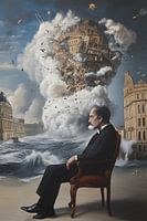 De surrealistische afbeelding toont een slapende man die ontspannen op een oude, sierlijk versierde stoel zit. Zijn gezicht is vredig en onaangeroerd terwijl hij wegzinkt in een diepe slaap. Om hem heen ontvouwt zich een dramatische scène: de wereld lijkt te veranderen in een chaotische wolk van puin die dreigend op hem af komt rollen.