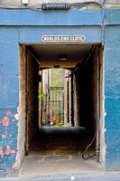 Als je je ooit hebt afgevraagd waar het einde van de wereld is, dan is het'aan de Royal Mile in de stad Edinburgh, Schotland, Verenigd Koninkrijk. Mooie vervallen ingang naar een omheinde tuin.