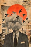 Een mysterieuze man in pak staat voor een felrode zonsondergang, terwijl vogels, die zweven als gedachten, uit zijn hoofdloze lichaam vliegen. Het contrast tussen de stedelijke omgeving en het surreële, met wolken bedekte hoofd weerspiegelt het streven naar vrijheid en identiteit. Er ontstaat een poëtische verbinding tussen de mens en…