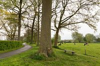 Fietspad Rhijnauwenselaan langs de Kromme Rijn. In het weiland ernaast staan koeien, Aan de bomen zit jong blad.