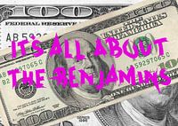 Een kunstdruk van 100 dollar biljetten en de tekst "It's all about the Benjamins".
