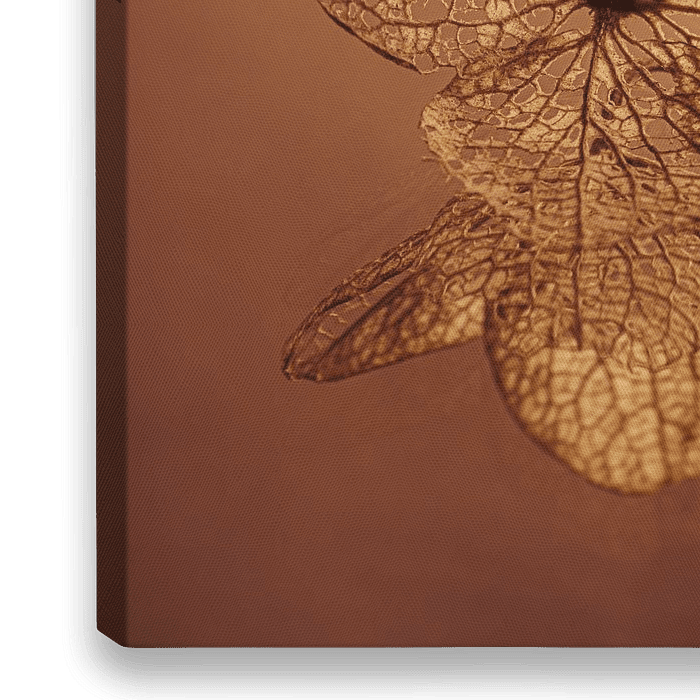 "Het gevallen hortensiablad" is een macrofoto van een hortensiablaadje, wat al deels vergaan is. Hierdoor zijn de nerven en de structuur van het blad goed te zien. Als je inzoomt op de foto kun je dit in detail zien. Deze foto is zo bewerkt dat het werk een warme uitstraling heeft gekregen. De kleuren lopen van beige achtig…