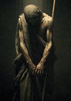 Een donkere, emotionele fine art afbeelding van een Christus-achtige figuur die lijden en spirituele last doorstaat. Het kunstwerk symboliseert opoffering, geloof en verlossing door middel van dramatische belichting en klassiek realisme.