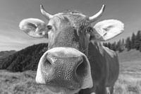 De groene heuvels en bossen van de Beierse Alpen strekken zich achter het dier uit, maar het landschap verdwijnt naar de achtergrond. Alles is gericht op dit ene moment: de nieuwsgierige nadering, het zachte briesen, de warme adem. Het patroon van de natte snuit weerspiegelt de uniciteit van elk individueel dier, zo individueel als een vingerafdruk.