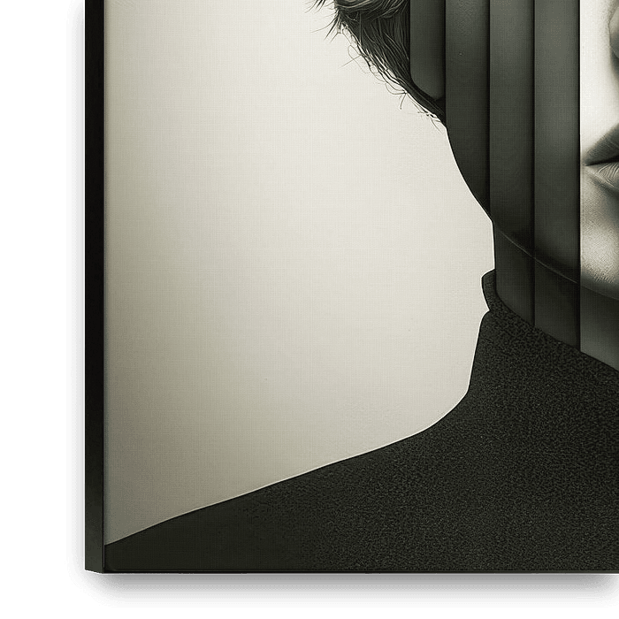 In deze afbeelding wordt het gezicht van een vrouw door verticale lijnen in smalle strepen verdeeld, wat een betoverend visueel effect creëert. De linkerhelft van haar gezicht is gehuld in diepzwart, terwijl de rechterkant schittert in helder wit. Ondanks deze extreme contrasten blijft het gezicht symmetrisch en kijken de serieuze,…