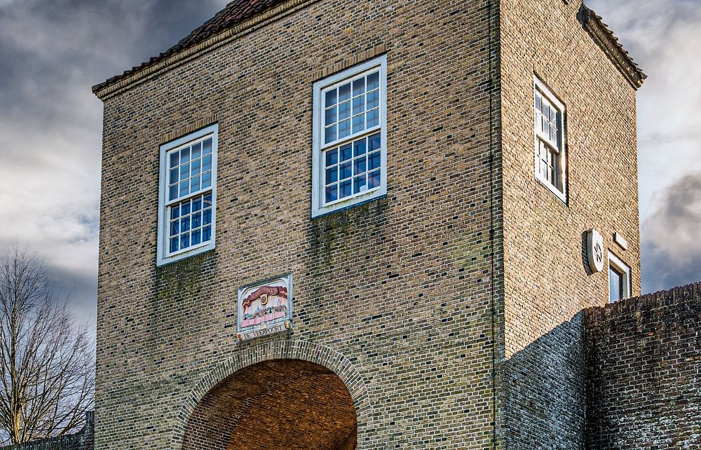 De Veerpoort in Heusden lijkt even tot leven te komen. Twee ramen kijken als ogen de wereld in en de poort zelf opent als een mond die verhalen fluistert uit vervlogen tijden.