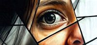Dit fascinerende schilderij toont het gezicht van een vrouw dat gedeeltelijk verborgen wordt door elkaar kruisende geometrische lijnen en vormen. De focus ligt op haar expressieve oogopslag, die wordt benadrukt door het contrast tussen zachte gelaatstrekken en geometrische elementen met scherpe randen.