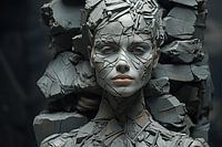 Dit surrealistische portret onthult de betoverende schoonheid van het gezicht van een jonge vrouw dat uit steen lijkt te zijn gehouwen. De delicate gratie van de vrouw ademt een sfeer van vergankelijkheid, terwijl haar lichtrode lippen een subtiel maar krachtig contrast vormen met de grijze stenen structuur.