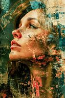 De vrouw in dit schilderij is niet zomaar een figuur, maar een canvas waarop stedelijke texturen en abstracte kleuren in elkaar overvloeien. Haar licht opgetrokken gelaatstrekken suggereren hoop of misschien verlangen. De combinatie van warme en koele kleuren creëert een complex emotioneel palet dat zowel vertrek als kwetsbaarheid weerspiegelt.