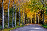 Bladeren met een gouden glans op een zonnige herfstochtend
