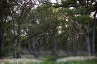 Verscholen achter duinen ligt dit bos,met bomen met rare vormen.