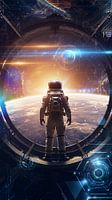 Een eenzame astronaut kijkt uit een cirkelvormig, futuristisch kijkgat naar het prachtige uitzicht op de aarde, badend in een warme, etherische zonsopgang en digitale overlays.