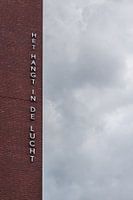 Tekst "Het hangt in de lucht" aan de muur gehangen op een gebouw met een donkere lucht er naast.