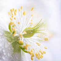 "Het hart van een witte bloem (Helleborus) met druppeltjes" is een extreme macrofoto van het hart van een Helleborus. De waterdruppeltjes die op de bloem liggen, geven een mooi effect vanwege de weerschiegeling / vertekening in de druppels van de omgeving/bloem. Omdat er boven (en een stukje naast) de bloem een donker object stond, ontstaat er in sommige druppels een mooie donkere lijn, die de druppels nog iets meer accentueert.