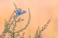Een heideblauwtje warmt zich op door de vleugels te openen en naar de zon te draaien.
