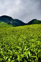Deze foto benadrukt de eenvoudige, rustgevende schoonheid van de Ciwidey theeplantages bij Kawah Putih. Het oog gaat verloren in de oneindige tinten groen die de heuvels bedekken, waardoor een bijna hypnotiserend landschap ontstaat. De perfect onderhouden rijen theeplanten vormen delicate lijnen die de natuurlijke rondingen van het land volgen. Een paar geïsoleerde bomen staan elegant tussen de plantages, als bewakers die waken over deze zee van vegetatie. Op de voorgrond verrijken varens en wilde planten het tafereel en herinneren ze ons aan het harmonieuze samenleven van wilde natuur en landbouw. Het diffuse licht, gefilterd door een licht wazige lucht, brengt de intensiteit van het groen naar voren en creëert een sfeer die zowel verkwikkend als vredig is. Niet alleen illustreert dit landschap het belang van thee in de Indonesische cultuur en economie, het belichaamt ook een plek van contemplatie en sereniteit, waar je het kalme ritme van de natuur kunt waarderen.