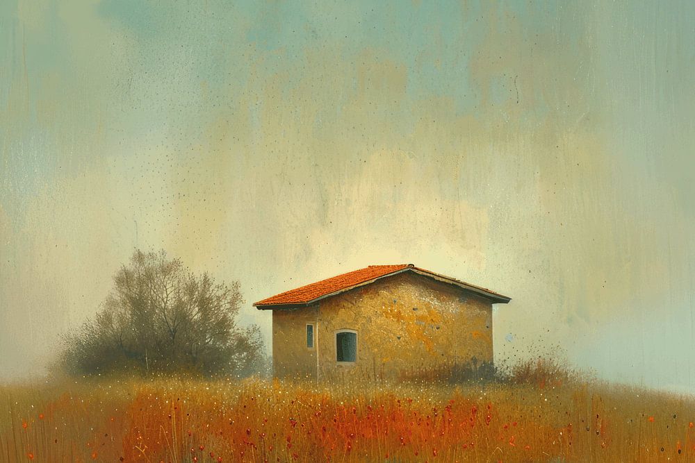 Het huisje op de heuvel. Een lieflijk huisje in warme tinten. Een plek waar iedereen wel zou willen wonen! Een bijzondere blikvanger voor je interieur.