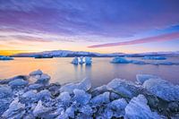 Het ijsschotsenmeer Jökulsárlón op IJsland tijdens een mooie zonsondergang met prachtige kleuren in de lucht die weerkaatsen op het ijs