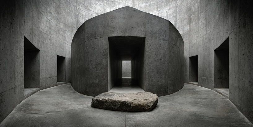 Dit beeld toont een ruimte die niet gedefinieerd wordt door beweging, maar door weerstand. In het midden staat een massief lichaam van beton, gesloten, zwaar en onwrikbaar. Het opent zich niet naar de zijkant, niet naar het licht, maar alleen frontaal - als een smalle, gecontroleerde doorgang. Architectuur wordt hier een verplichting,…
