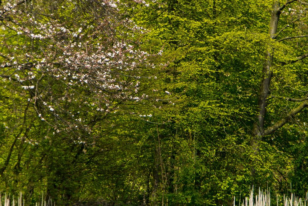 Het Bos in de Lente. De reflectie van het riet in het water, de bloesem aan de bomen, de verschillende soorten groen, vormen een vrolijk geheel. Gemaakt in het Schollebos in Capelle aan den IJssel.