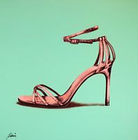 Sandaal. Schoen. Hoge hak. Een vrouwenschoen op een turquoise achtergrond.