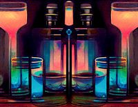 Een decoratief cocktailtafereel met flessen en glazen in felle kleuren. Een blikvanger aan de muur bij uw volgende cocktailparty of in uw hotel, restaurant of bar.