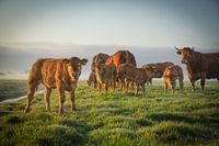 Koeien in de wei met kalfjes. In het voorjaar mag bij boer Salman en zijn zoon in Noordwijk de koeien met hun nieuwe kroost weer naar buiten. Prachtig om te zien hoe blij ze zijn en als je dan ook nog een mooie zonsopkomst hebt met nevel is het plaatje helemaal compleet.