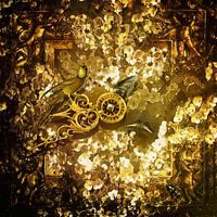 De klok geeft het aan, het is echt tijd voor de zomer. Iedereen is er aan toe. De vogels, de vlinders, de torren, alle levende wezens zijn toe aan de zomer. De mensen natuurlijk sowieso. Deze klok bestaat uit victoriaanse engeltjes en andere decoraties op de rand van deze warme goudkleurige klok. De wijzers staan op kwart voor negen. Vanuit het midden van de klok komen voorjaarsbloesems rijkelijk naar voren. Ze gaan vanuit het midden over de rand van de klok naar buiten, of natuurlijk naar binnen, het is maar hoe je het bekijkt. De zon is niet in beeld maar het felle zonnige licht van de zon is wel heel duidelijk aanwezig. Tijd voor de zomer letterlijk en figuurlijk. Wanneer het voor u ook altijd tijd is voor de zomer, dan is dit werk is voor u. De kleuren van dit victoriaanse, impressionistische surrealistische werk zijn, in stijl van die tijd namelijk goudkleurig, goud, zacht groen, zwart en crème.