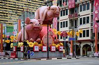 De mensen vieren het jaar van het varken in Chinatown in Singapore, Azië.