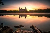 Geweldige ochtendstemming met mist in een rivier en zonsopgang achter een kasteel. Mooie reflectie in rustig water