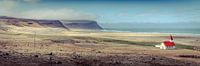 De ligging van het kerkje benadrukt de indrukwekkende wijdsheid en stilte van deze afgelegen regio. In de verte rijzen de dramatische kliffen van Látrabjarg op – de westelijkste punt van Europa en een van de hoogste vogelkliffen ter wereld. Deze imposante rotswanden vormen een majestueus decor dat de scène haast surrealistisch maakt. De combinatie van het kleine, ingetogen gebouw met de weidse, bijna buitenaardse natuur versterkt het gevoel van nietigheid en verwondering dat IJsland zo kenmerkt.