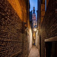 Achter de Vismarkt in Breda, midden in het centrum, ligt dit smalle steegje. Het biedt een bijzonder uitzicht op de toren van de Grote Kerk. Vroeger zat hier de ingang van het café het Klapcot, waar ik trouwe bezoeker was. In de honderden keren dat ik de kroeg bezocht, is me de bijzondere doorkijk eigenlijk nooit opgevallen. Maar nu, met camera in de hand, bezoek ik dit kleinste steegje van Breda met alle plezier om er een mooi beeld van te maken.