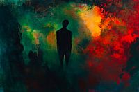 Een mysterieuze schaduw steekt af tegen een levendige achtergrond waarin diepgroen speelt met heldere roodtinten. Deze combinatie van duisternis en licht brengt een betoverende sfeer in elke kamer. Ideaal voor een moderne woonkamer, waar het de verbeelding kan prikkelen en kan inspireren tot diepere gesprekken.