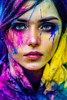 Een levendig portret dat de innerlijke diversiteit van de mens verbeeldt door middel van uiterlijke kleuren. De jonge vrouw, gehuld in een spectrum van Holi-kleuren, belichaamt niet alleen de uitbundige viering, maar ook de veelzijdige emoties en ervaringen die ieder van ons vormen. Te midden van de kleurrijke drukte wordt ze een canvas van het leven, waarop moed, vreugde en passie in levendige tinten worden weergegeven. Elke kleur op haar huid vertelt over een hoofdstuk in haar leven dat ze moedig onder de knie heeft gekregen en daagt ons uit om onze eigen ware kleur te laten zien.