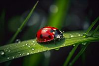 Het lieveheersbeestje heeft een opvallend felrode kleur met zwarte stippen, die prachtig afsteekt tegen de zachte groene achtergrond. Zijn kleine, ronde ogen zijn glanzend zwart en kijken nieuwsgierig naar de camera. Zijn vleugels zijn prachtig gevouwen en rusten zachtjes tegen zijn lichaam aan.