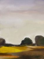 Een landschapswerk uit Midden-Europa met een koolzaadveld en een klein bos op de achtergrond. Vergezeld van een bewolkte hemel in zachte pasteltinten.