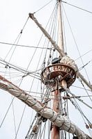 Indrukwekkend kraaiennest boven in een mast van een historisch schip.