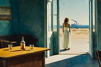 Dit schilderij in de stijl van Edward Hopper toont een woonkamer met heldere lijnen en gedempte kleuren. Een halflege fles whisky en twee gebruikte glazen staan op een effen tafel - sporen van een gesprek dat voorbij is. De deur naar de veranda staat open, de kamer oogt verlaten en geladen tegelijk. Buiten, tegen het licht, staat een vrouw. Haar blik is gericht op de open zee, waar een stoomschip langzaam aan de horizon verdwijnt. Ze staat stil, verloren in zichzelf, onbeweeglijk - een figuur tussen het heden en de herinnering. De foto vangt dat vluchtige moment tussen nabijheid en afstand, tussen iets dat was en iets dat net weggaat. Het is stil, maar niets aan deze stilte is leeg.
