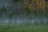 De zonsondergang in de Taiga in Finland. Waarbij de zon nog de laatste bomen belicht en de mist in het bos opkomt. 41,5 MP