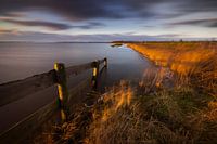 Het laatste warme licht van een koude winterdag verlicht het landschap bij het Nationaal park Lauwersmeer in Groningen. De zonsondergang geeft de voorbijdrijvende wolken een mooie gloed.