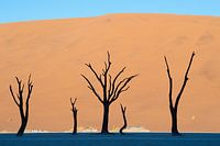 Een landschapsfoto van vijf boom silhouetten in Deadvlei (Namibië) in de vroege ochtend.De zon die net over een duin komt beschijnt de achterliggende duin maar de vallei-vloer en de bomen nog net niet.