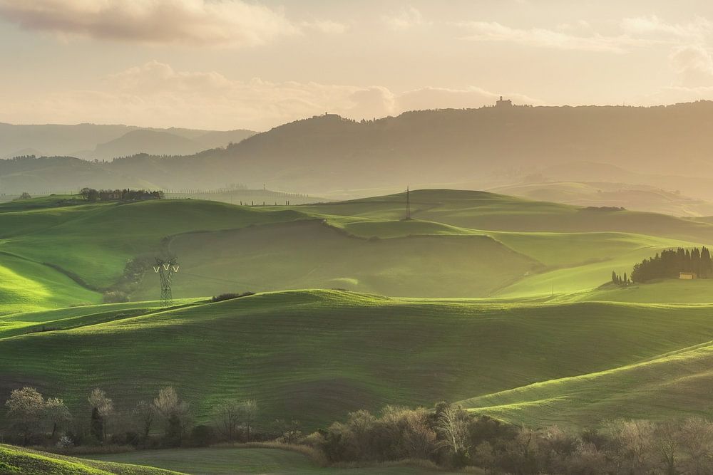Landschap, glooiende heuvels, klein meer, cipressen en olijfbomen bij zonsopgang. Volterra, Toscane, Italië, Europa