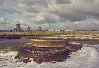 De sneeuw het landschap met wolken en de Zaanse molens en de weilanden. Op de voorgrond de oude molenstenen de sloten bevroren in de winter. De nieuwe industrie ver op de achtergrond. Deze foto is een klassiek beeld van de Zaanstreek. Het winterse landschap geeft wel een extra charme aan de foto.