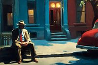 Een man in een licht pak en met een hoed zit op een lage trede voor een herenhuis. De scène speelt zich blijkbaar laat in de avond of in de schemering af. Achter hem schijnen twee ronde lampen boven een voordeur, terwijl de gevel in koele blauwe en turquoise tinten is gehouden. Rechts op de voorgrond staat een rode auto, waarvan de…
