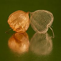 "Het leven is vergankelijk: Fragiel en kwetsbaar maar samen" is een foto van twee prachtige lampionnetjes van de lampionplant. Deze twee lampionnetjes zijn qua vorm vrijwel hetzelfde maar qua "huid" verschillen ze enorm. Het linker lampionnetje (vanuit de kijker gezien) heeft zijn oranje huidje nog. Je kunt wel zien dat deze al door de zon wat gedroogd is. Hierdoor zie je de nervenstructuur heel mooi in de huid zitten. Als je op de foto inzoomt kun je dit mooi zien. Ook kun je dan zien dat bij het rechter lampionnetje er slechts een nervenstructuur is overgebleven. De rest van de huid is vrijwel helemaal verdwenen. Deze warme gouden structuur is prachtig te zien tegen de warme groene achtergrond (Ik zou deze kleur groen zelf omschrijven als pistachegroen).