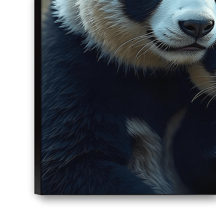 De panda in het midden, mogelijk de belangrijkste focus van de foto, heeft grote, ronde ogen die vol leven en intelligentie zijn. Hij kijkt recht in de camera alsof hij de kijker uitnodigt in zijn vredige wereld. Het fijne, zwarte haar rond zijn ogen lijkt te glimlachen en zijn snuit gaat lichtjes omhoog terwijl hij met een verse bamboetak speelt. De textuur van zijn vacht lijkt bijna tastbaar en de fijne details van de afzonderlijke haren zijn duidelijk herkenbaar.