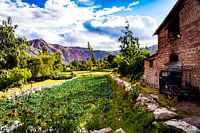 Een prachtige foto die alle rijkdommen bevat die de Heilige Inca Vallei in het Andesgebergte in Zuid-Amerika te bieden heeft. We zien een traditioneel gebouwd huis met een tuk tuk, prachtige groene velden met bloemen en kleurrijke indrukwekkende bergen. Deze stralen een mysterie uit die dit heilige land omvat. Deze plaat laat prachtige natuur zien zij aan zij met de zorg die de traditionele lokale bevolking ervoor draagt.