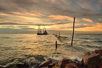 Het lichten van de palingfuiken op het IJsselmeer bij zonsopkomst.